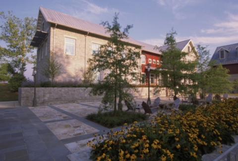 View of the Instruction West building and patio at the National Conservation Training Center.