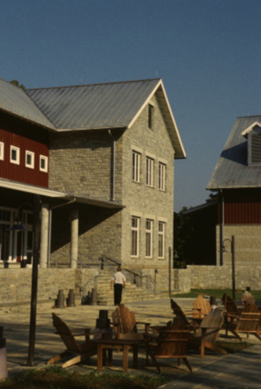 Student walking across patio in front of Instructional West building at the National Conservation Training Center.
