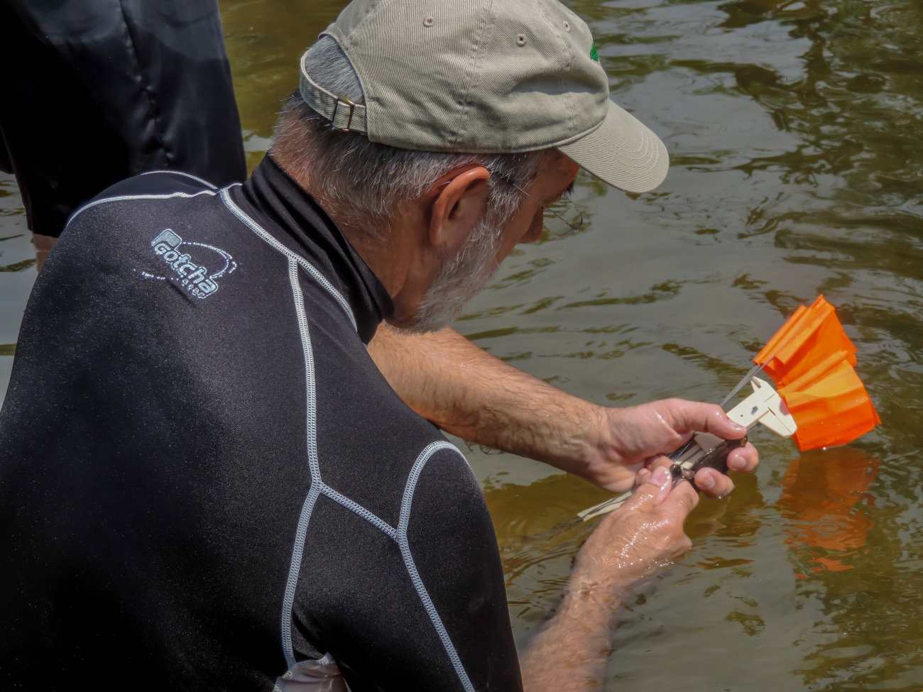 Instructor examines a native mussel in the Cacapon River, WV.
