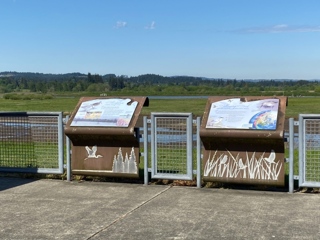 Interpretive signs tell the story of the refuge at several locations near the Visitor Center and along the year-round River Trail. Most of these signs have about 28 inches of clearance beneath the sign, with the sign content at about 36" off the ground.