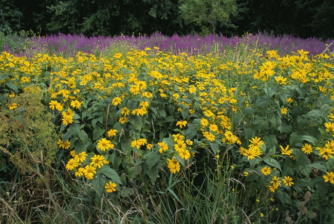 Purple loosestrife an invasive flowering plant is seen here taking over native wildflowers in a field at Montezuma National Wildlife Refuge.