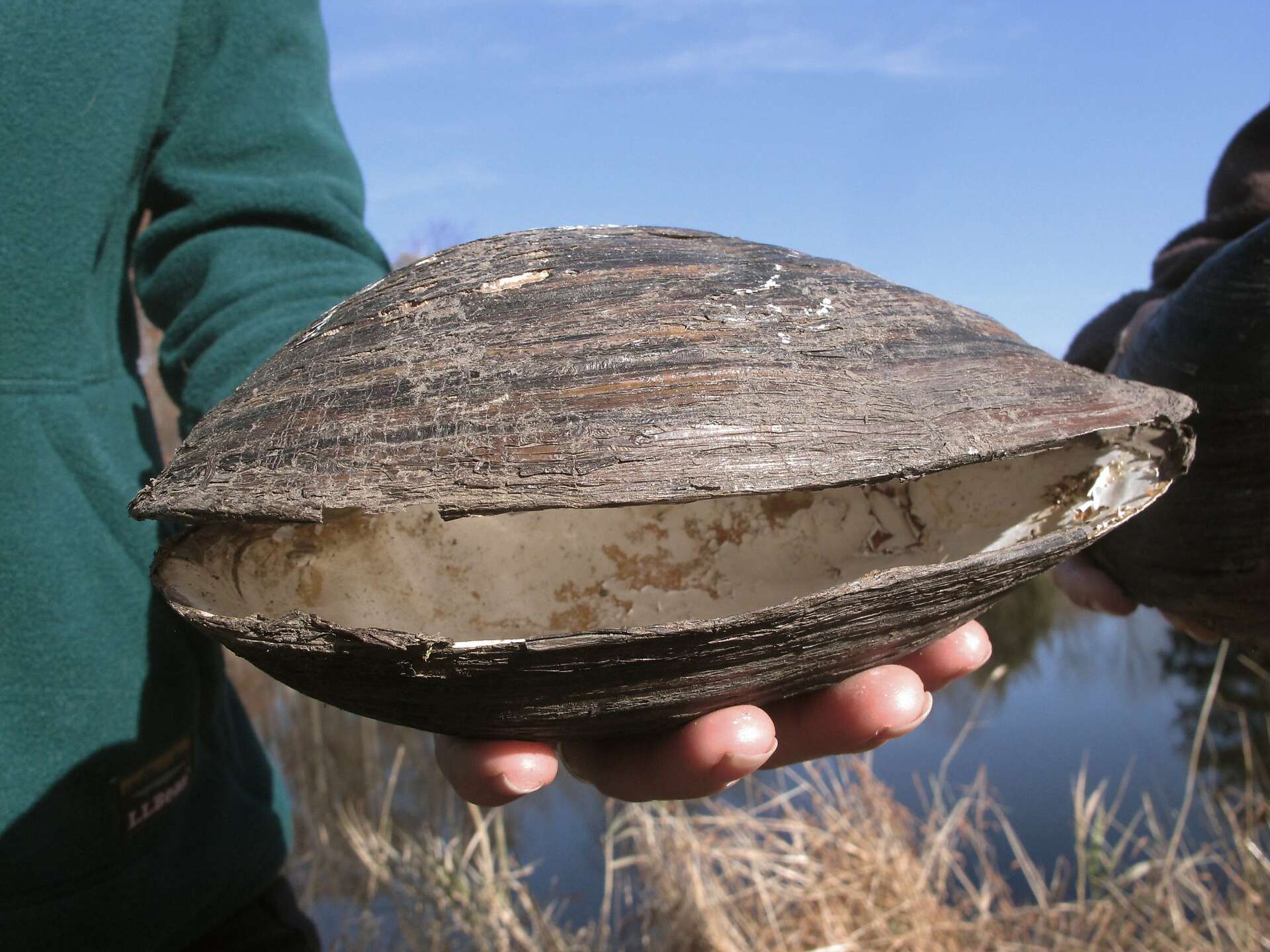 A person holds the shell of the invasive silty pond mussel in New Jersey.
