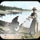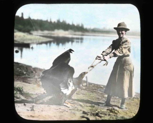 William's wife Irene Finley torments young Condor "General" by playing game of keep away at the Finley home in Oregon named Jennings Lodge
