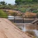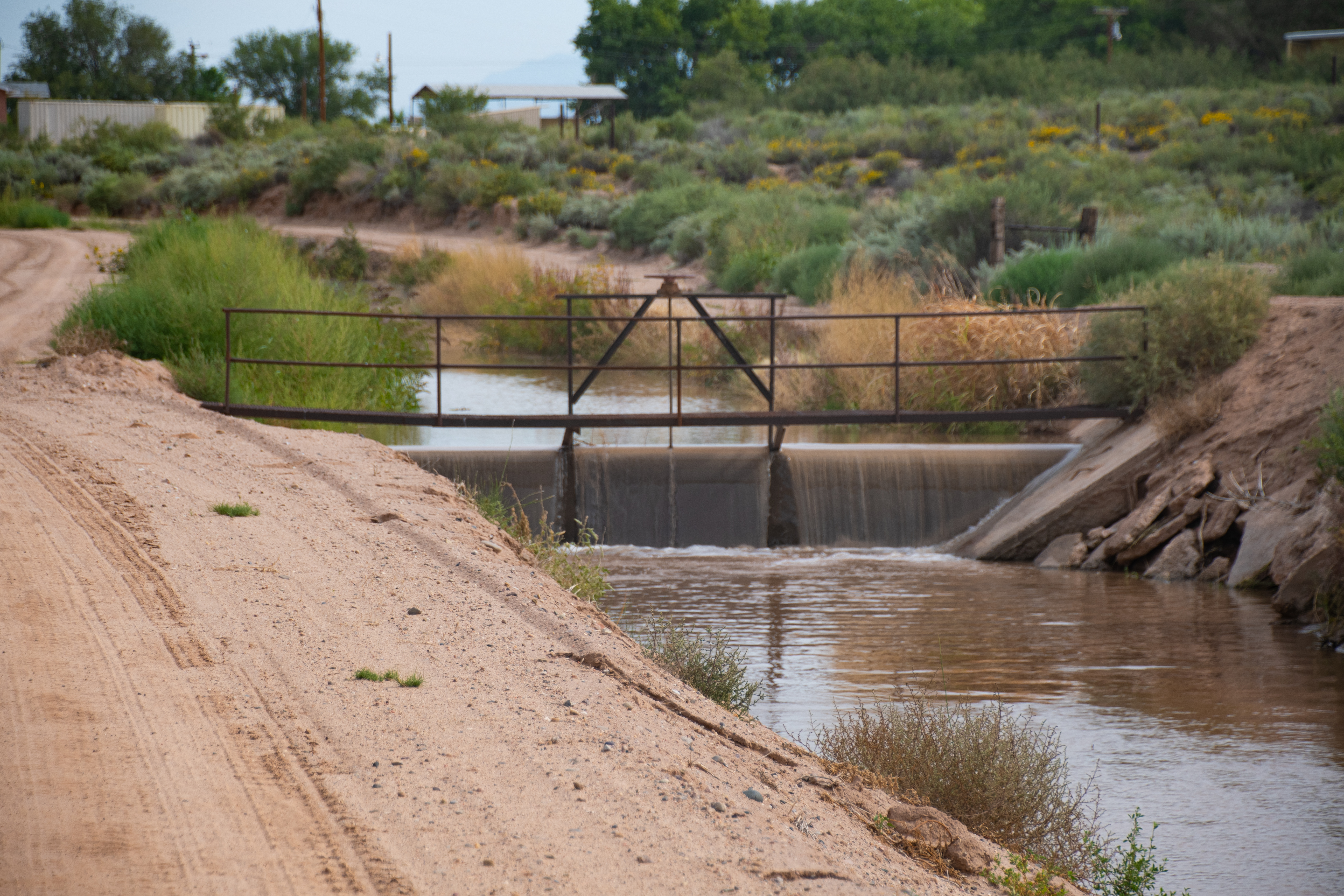 Along the Rio Grande in New Mexico water is diverted from the river to irrigate crops by flooding fields through the use of sluice gates.
