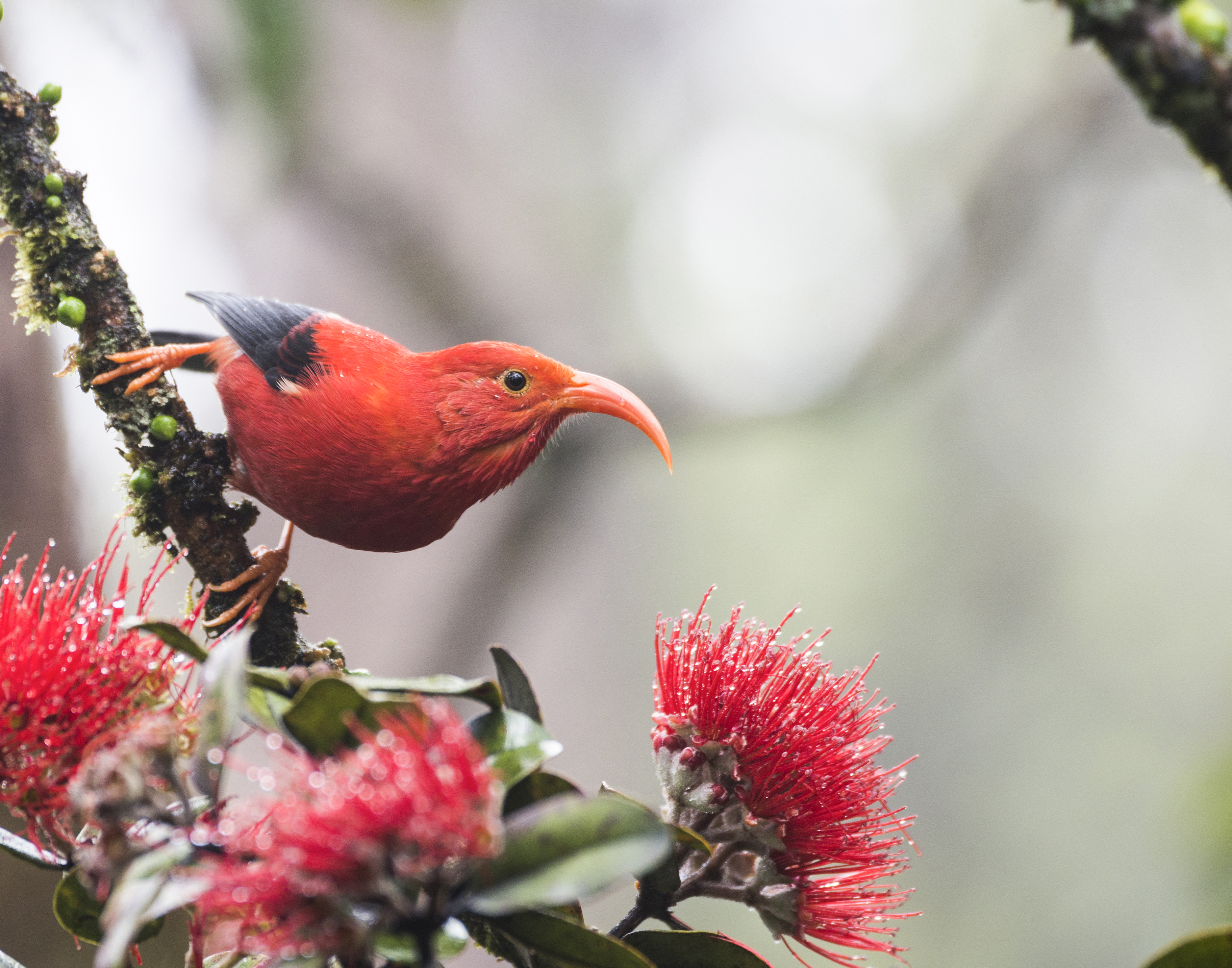 About 90% of the ‘i’iwi population lives in a narrow band of forest on the windward slopes where it is too cold for the mosquitoes that spread avian malaria. Photo by Jim Denny