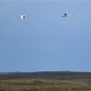 Two tundra swans fly over Izembek National Wildlife Refuge.