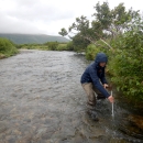 A scientist takes measurements in a stream in Izembek National Wildlife Refuge.