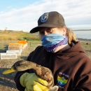 Administrative Support Assistant, Jane Cardwell preparing Mallard for the duck banding process