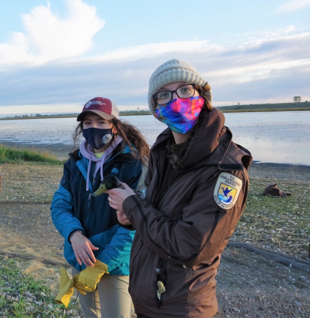 Johannah McCollum, Wildlife Refuge Specialist and Kelly Kaye, Biological Science Technician collecting wild ducks from the rocket net trap for banding.