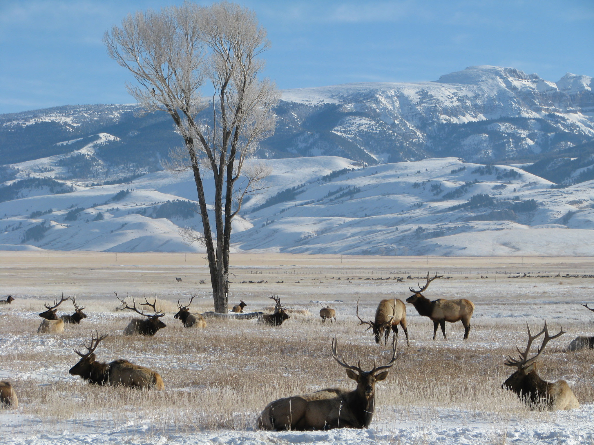This classic view from Highway 89 is a common winter site on the refuge. The lone cottonwood tree is called the Winegar Tree, named after a family that homesteaded in that location. The tree sits alongside Flat Creek.