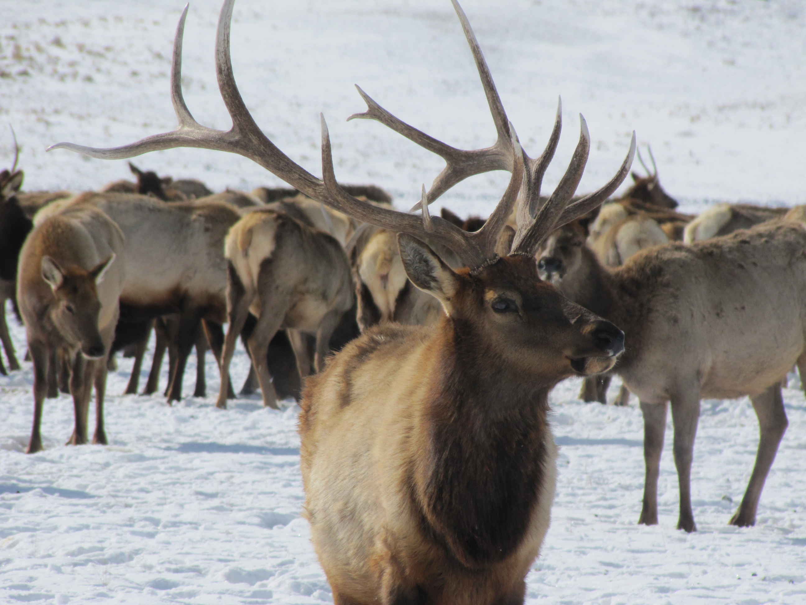 A bull elk sports a beautiful set of antlers in early March. The elk and the antlers may soon part ways. The largest bulls begin dropping their antlers in early to mid-March. Spring migrations to calving and summer range begin when the snow recedes and new vegetation appears, usually in April and May. Elk are the primary wildlife species occupying the National Elk Refuge, and their conservation is the reason the refuge was established. The refuge provides winter habitat for the Jackson Elk Herd.