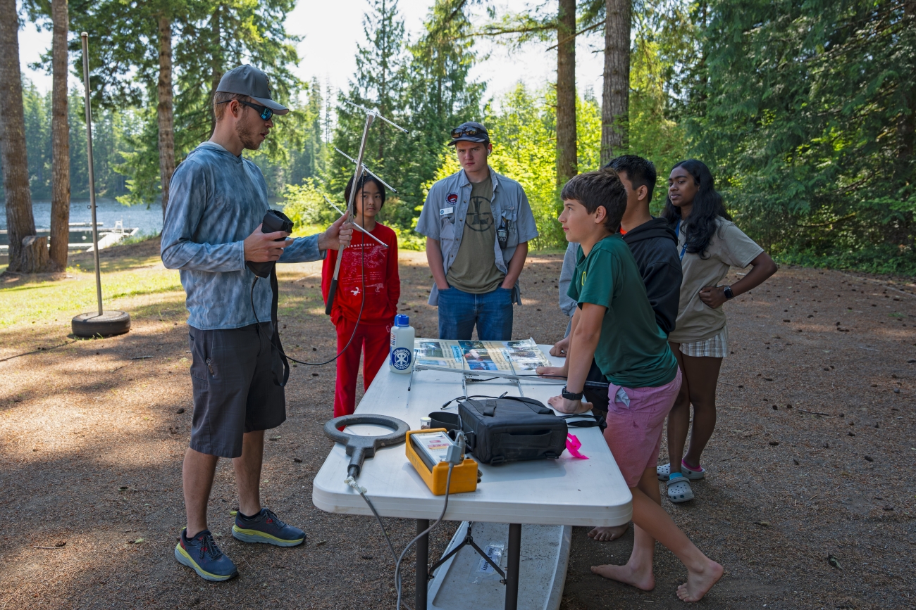 Jakob Bengelink leads a fisheries science technology lesson with fly fishing academy campers.