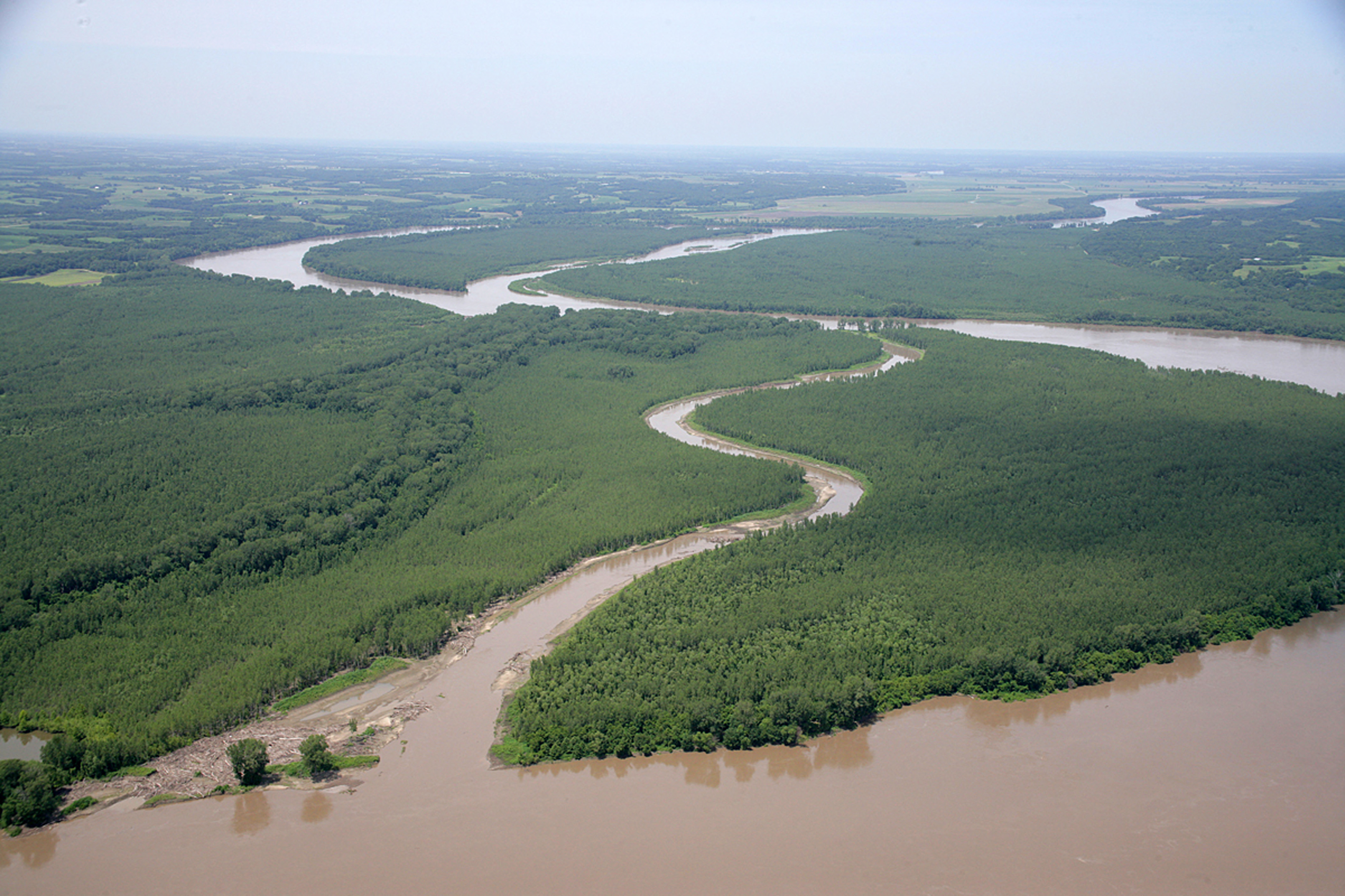 Aerial view of Jameson Island and Lisbon Bottom in the Missouri River from C. Bittner, looking south; muddy red river twisting through floodplain.
