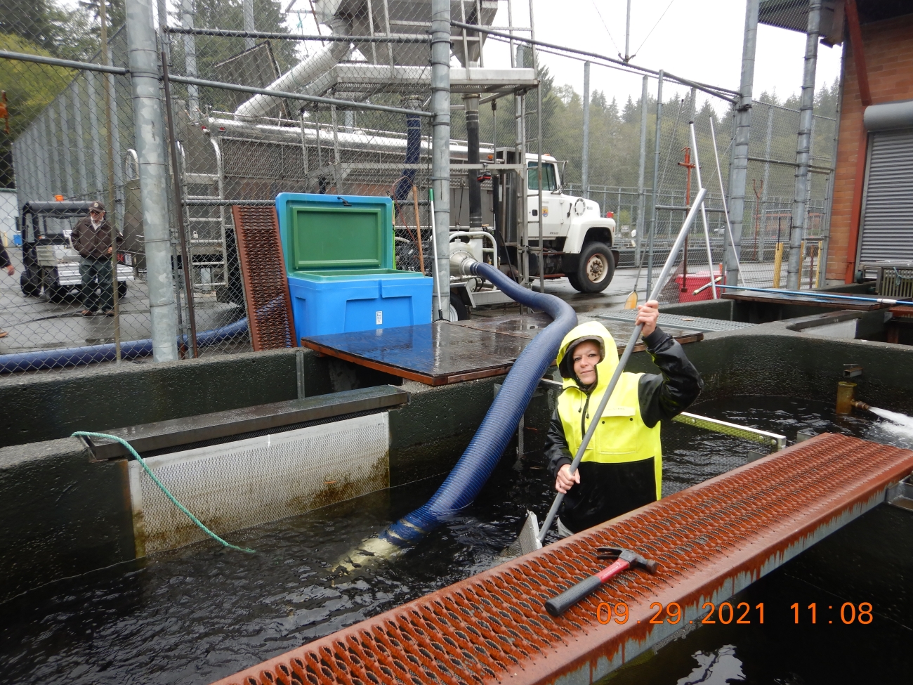 Quinault National Fish Hatchery Fish Culturist, Jane Lemieux, crowding juvenile steelhead to a fish transfer pump system hose.