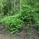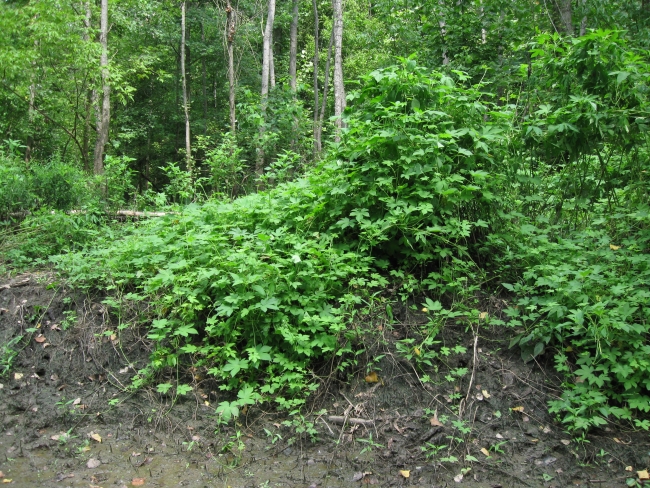 Invasive vine growing on old tree stump and spreading out around on the ground.