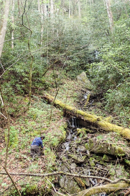 Service biologist Jason Mays works his way up the side of the Nantahala River Gorge, searching for noonday globe snails.