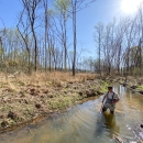 Biologist Jason Mays walks Stevens Creek, in Mecklenburg County, N.C., running a detector across the stream bottom to find previously stocked mussels. The mussels were fitted with a tag that has a unique, identifying letter/number combination, just like the chips used on pets. When the wand passes by one of the tagged mussels, the data logger logs the number of the mussel detected.