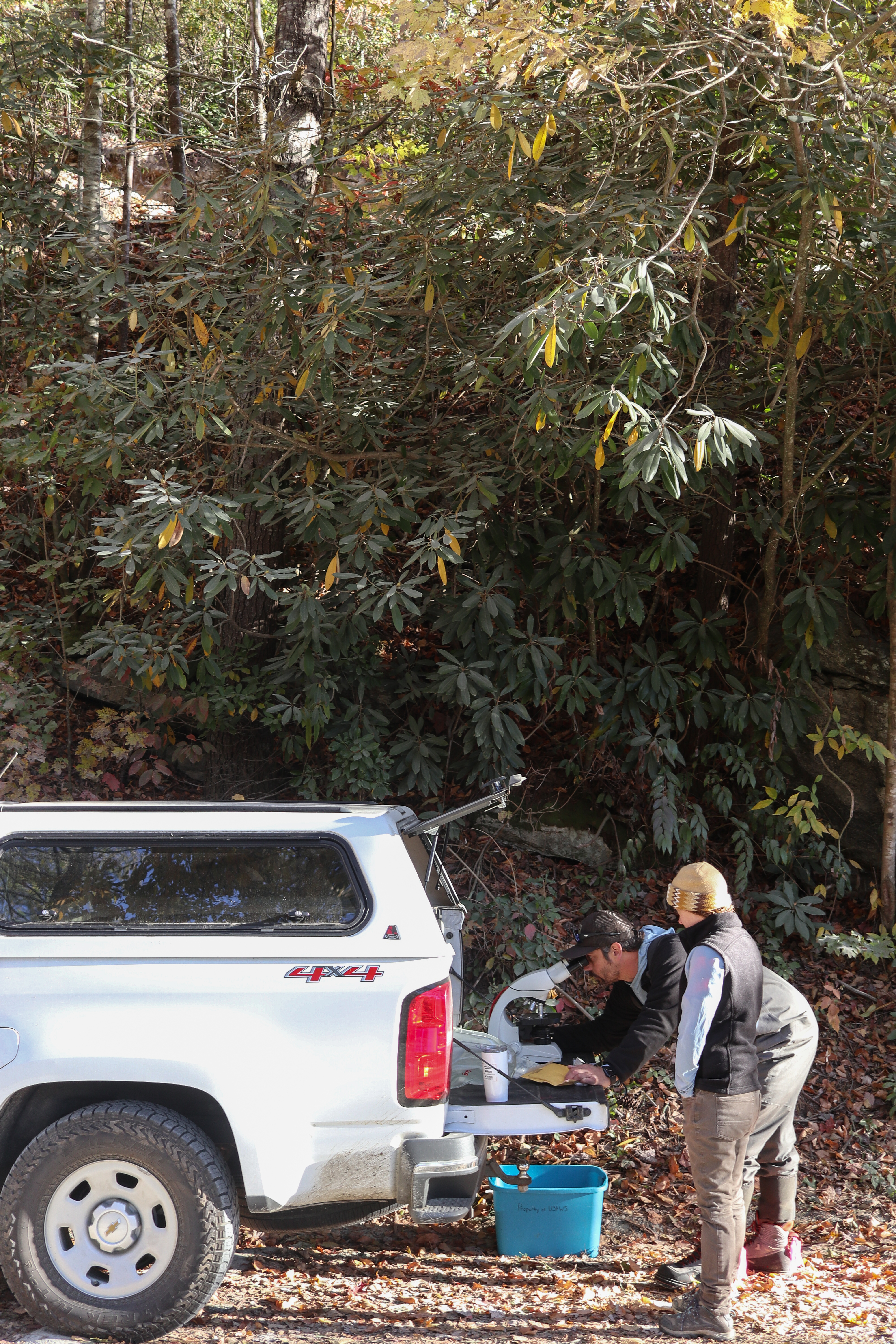 Jay Mays and Madison Polera, US Fish and Wildlife Service, examine a water sample taken from the Little River at DuPont State Forest, Transylvania County, NC.