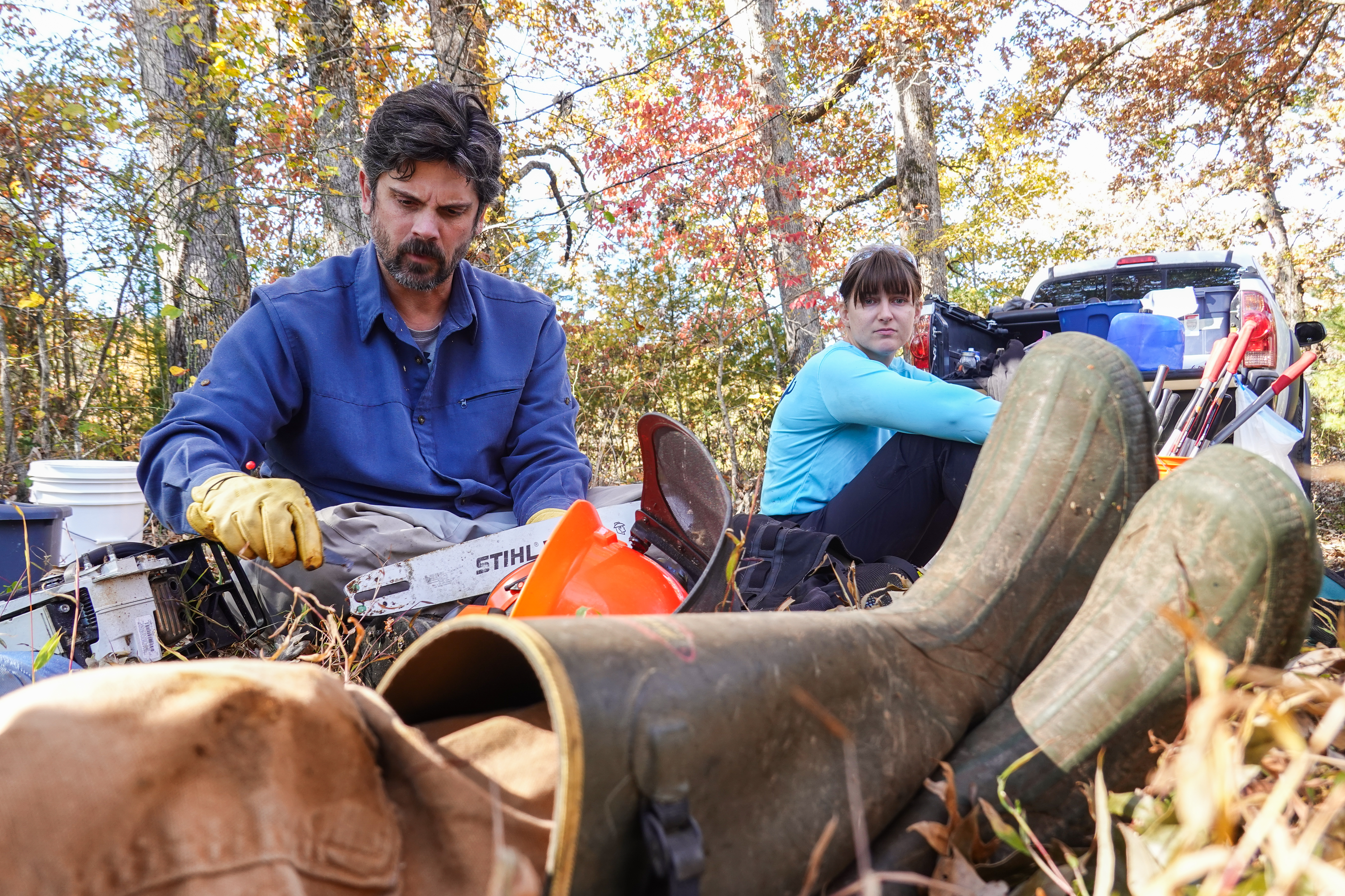 Jay Mays, US Fish and Wildlife Service, cleans his chainsaw bar during a lunch break, while seated beside Ansley Williamson, US Fish and Wildlife Service. Henderson County, NC.