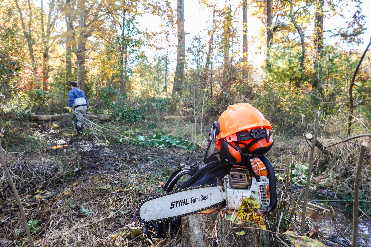 Jay Mays, US Fish and Wildlife Service, pulls European alder limbs from a Henderson County, NC wetland and chain sawing several of the trees.