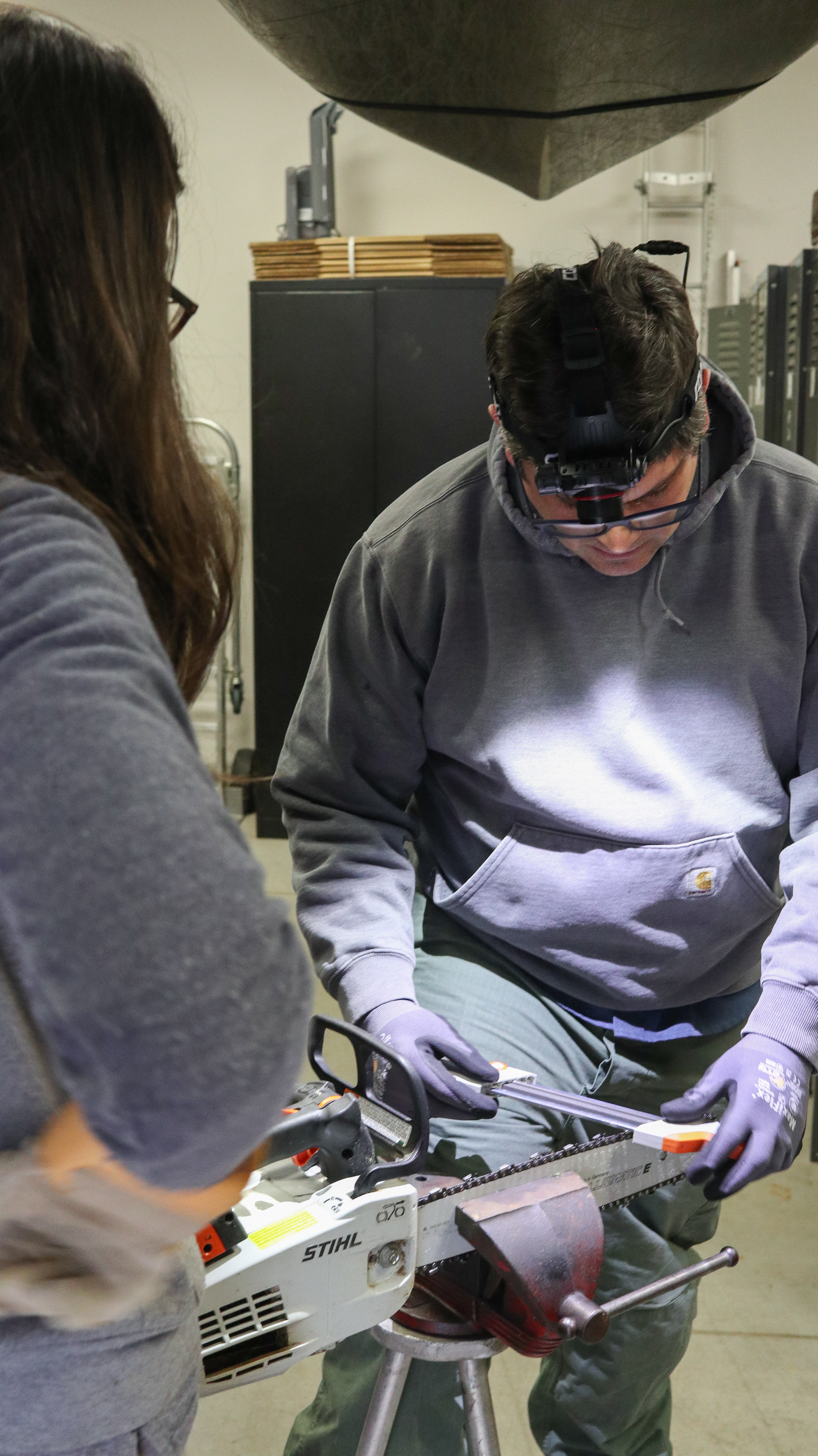 Jay Mays sharpening a chainsaw