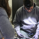 Jay Mays, U.S. Fish and Wildlife Service, sharpens a chainsaw chain during a chainsaw user refresher class