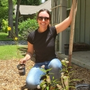 Jenna King planting native plants in office garden.