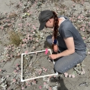 California Waterfowl Association (CWA) Biological Technician Jessica Burroughs surveying plants with a sampling square in the foredunes of Ma-le'l as part of the dune restoration project.