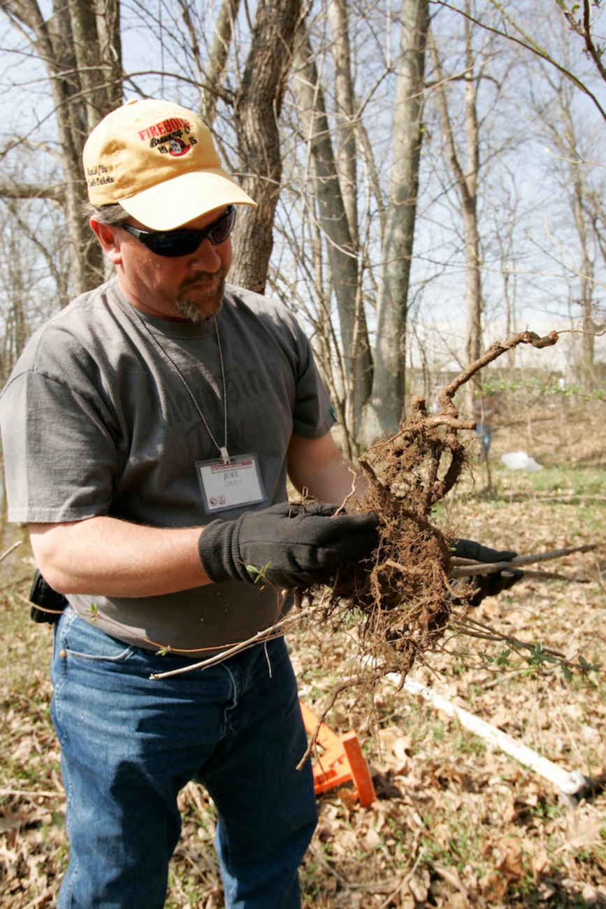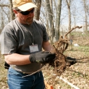 A student enrolled in WLD2139 Invasive Plant Management, a course offered at the USFWS National Conservation Training Center examines the root system of a jetbead he dug up - an invasive exotic shrub from Asia most likely spread from landscape plantings.