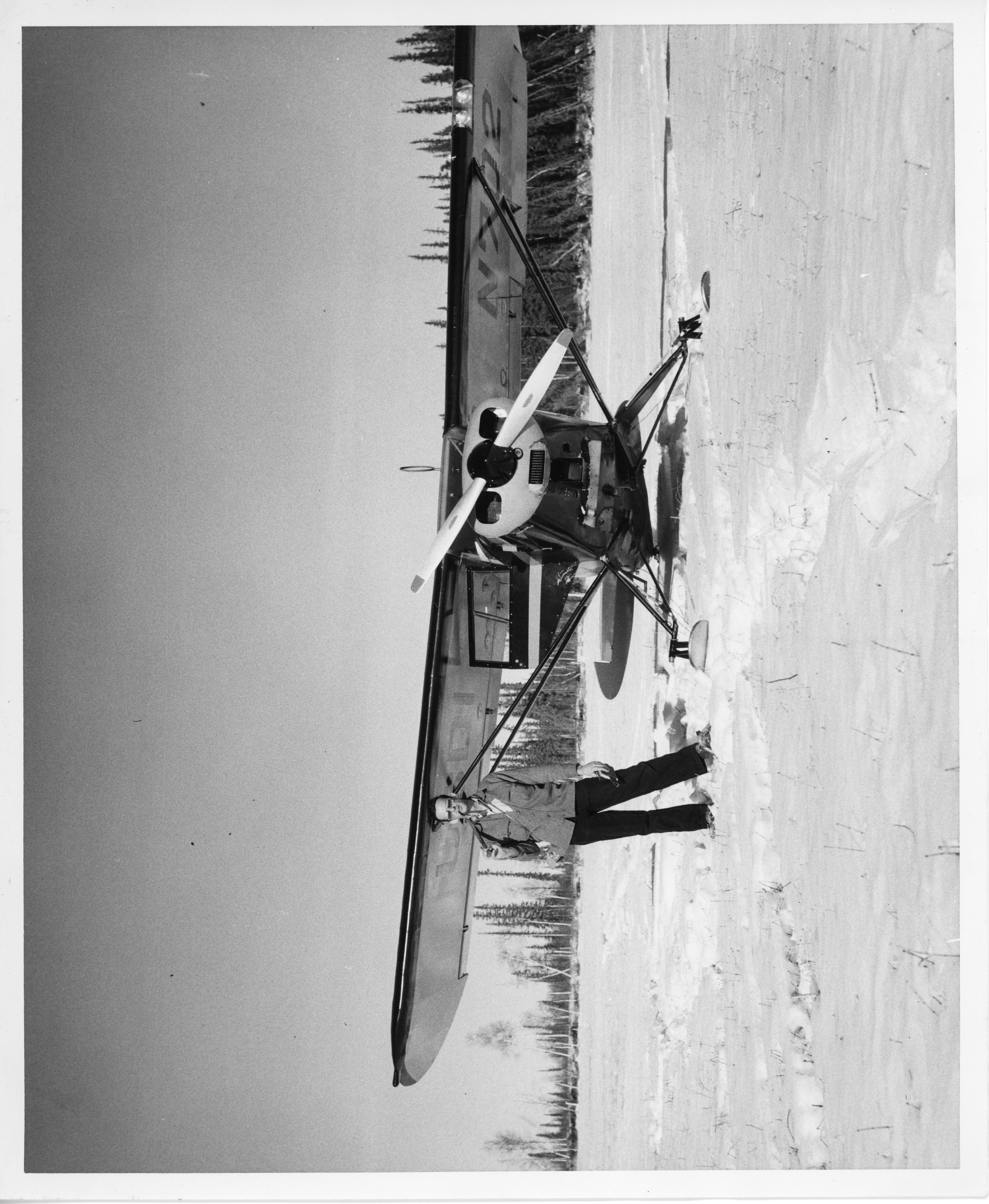 Agent Jim King (with an axe over his shoulder) prepares to walk to an illegal beaver set about 1/2 mile in the background. U.S. Fish and Wildlife Service aircraft N 702. 20 miles southwest of Galena, Alaska.