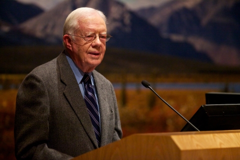 Former President Jimmy Carter speaks at the National Conservation Training Center symposium to honor the Arctic National Wildlife Refuge 50th anniversary.