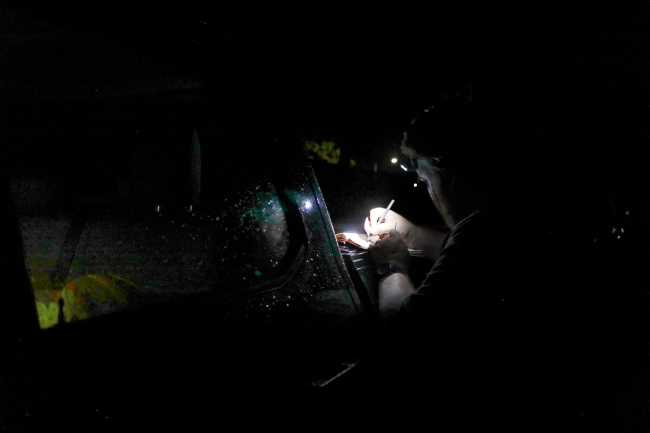 Joey Weber, NC Wildlife Resources Commission, notes the number of bats counted at an emergence count at a bridge across the Pigeon River, Haywood County, NC.