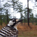 Red-cockaded woodpecker in a longleaf pine forest. The black lines on the image represent the rule of thirds.
