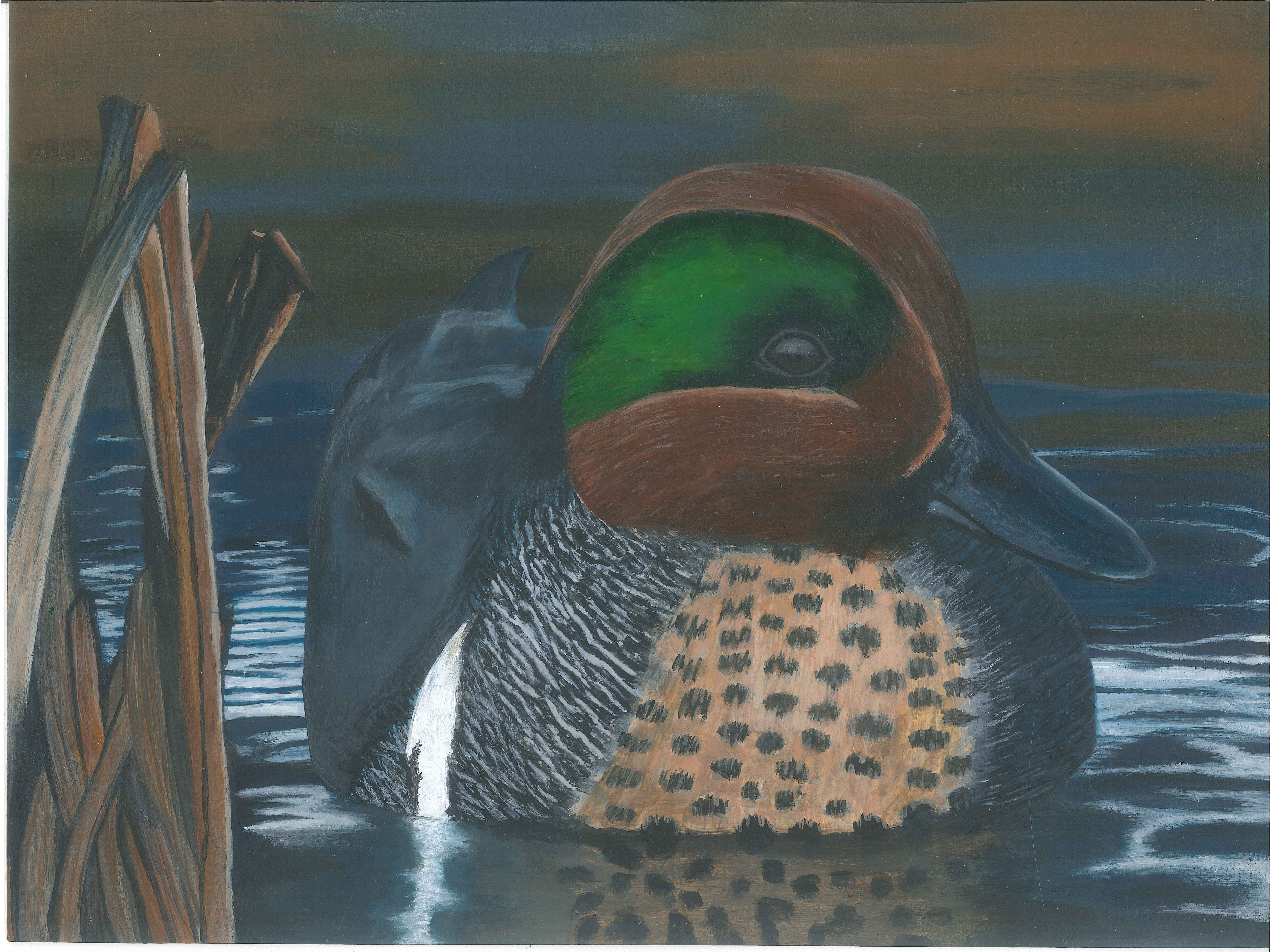 2021 Nevada Best in Show. Painting of a green-winged teal drake floating in a wetland.