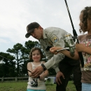 A little girl tries her hand at fishing for the very first time, smiling all the way.