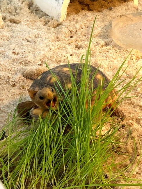 Juvenile Gopher tortoise feeding on rye grass. Gopher tortoise head-starter program.
