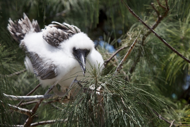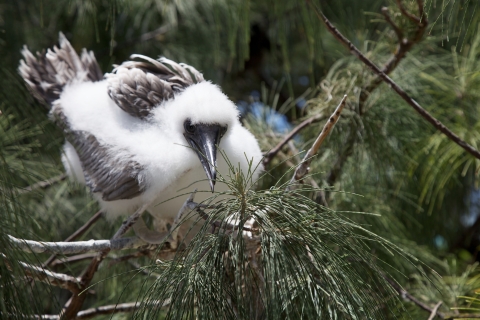 Red-footed boobies are the smallest of all boobies. Their legs and feet are red and the bill is pale blue. Juveniles are wholly brown or blackish gray with black bill and facial skin and gray legs. Immature have patchy underwings without definite pattern, white back, mottled gray-brown head, and red or brownish legs. They are polymorphic; few seabirds display such a variety of color phases. Well adapted for diving and feature long bills, lean and aerodynamic bodies, closeable nostrils, and long wings which they wrap around their bodies before entering the water.