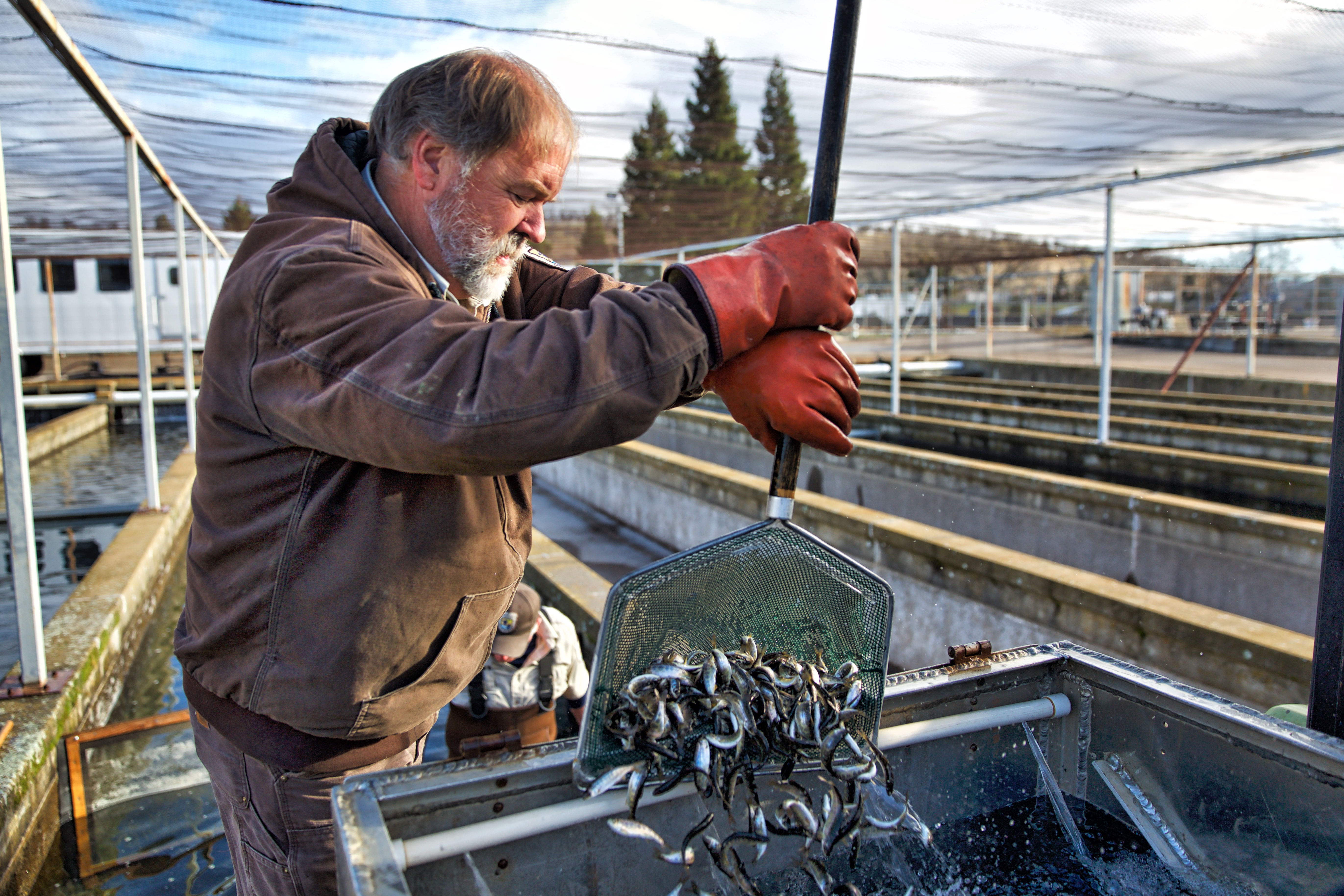 Jeff Freund at Coleman National Fish Hatchery scoops winter-run Chinook salmon on March 2 before they were trucked to Battle Creek later that morning. Approximately 29,000 salmon were released into the North Fork of Battle Creek, a tributary of the Sacramento River where they once thrived. The fish are from the Livingston Stone National Fish Hatchery captive broodstock program.