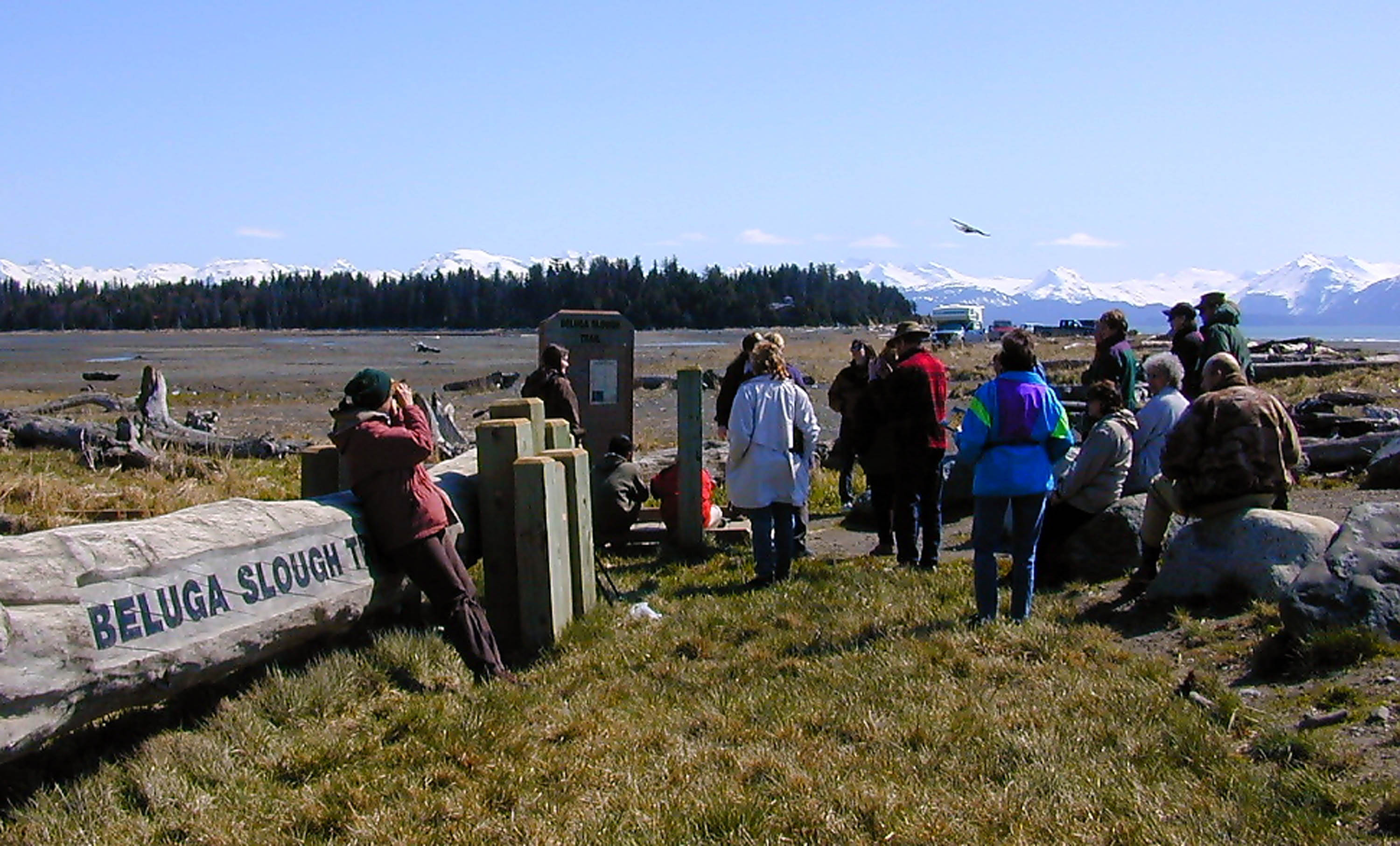 Participants of a Bird Walk gather at Beluga Slough in Homer, Alaska during the Kachemak Bay Shorebird Festival which is held each May on the weekend closest to the 9th of May. The festival is sponsored by Alaska Maritime National Wildlife Refuge and the