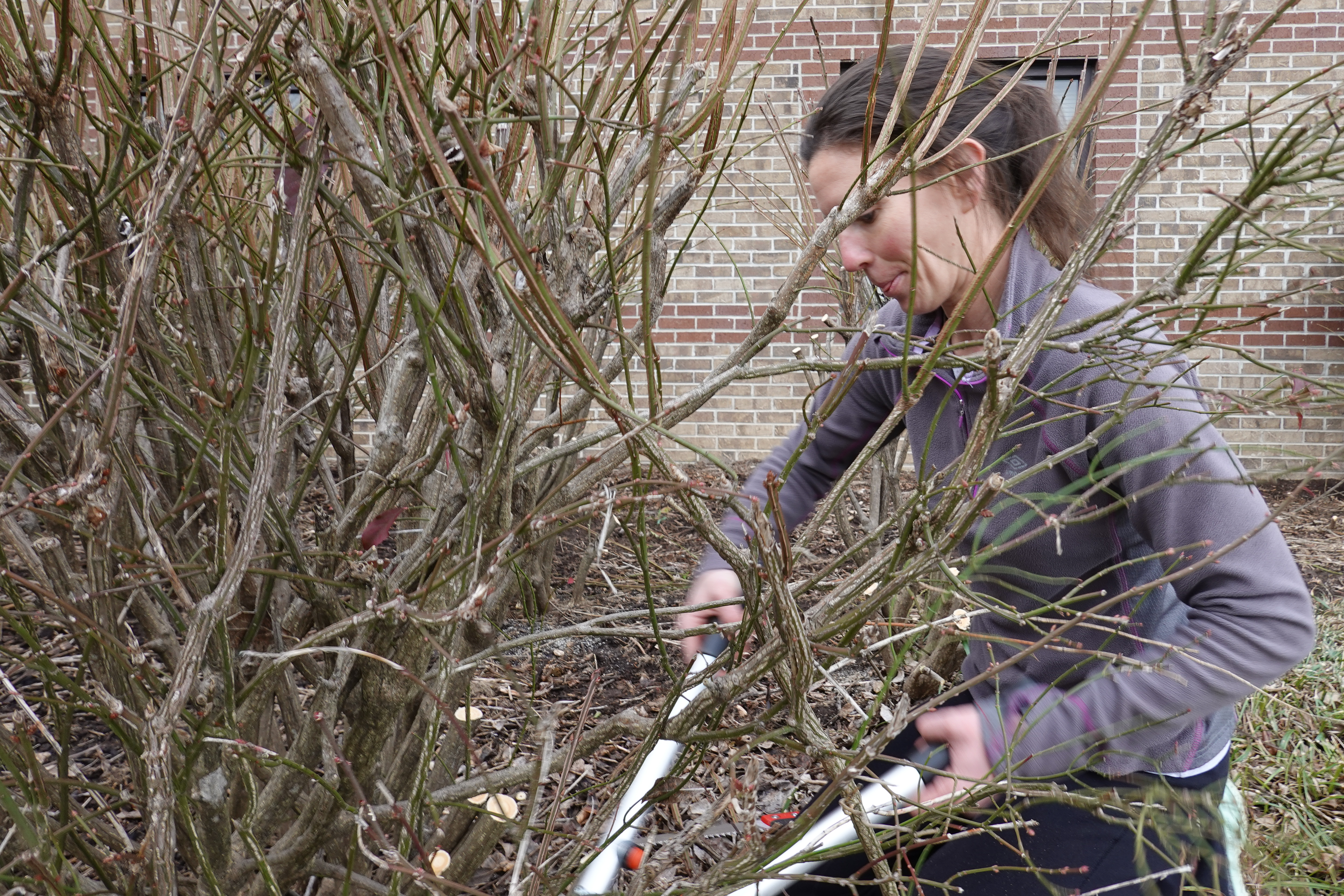 Asheville Field Office staff member Karla Quast cuts at the original landscaping shrubs to make way for the new pollinator garden.