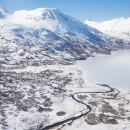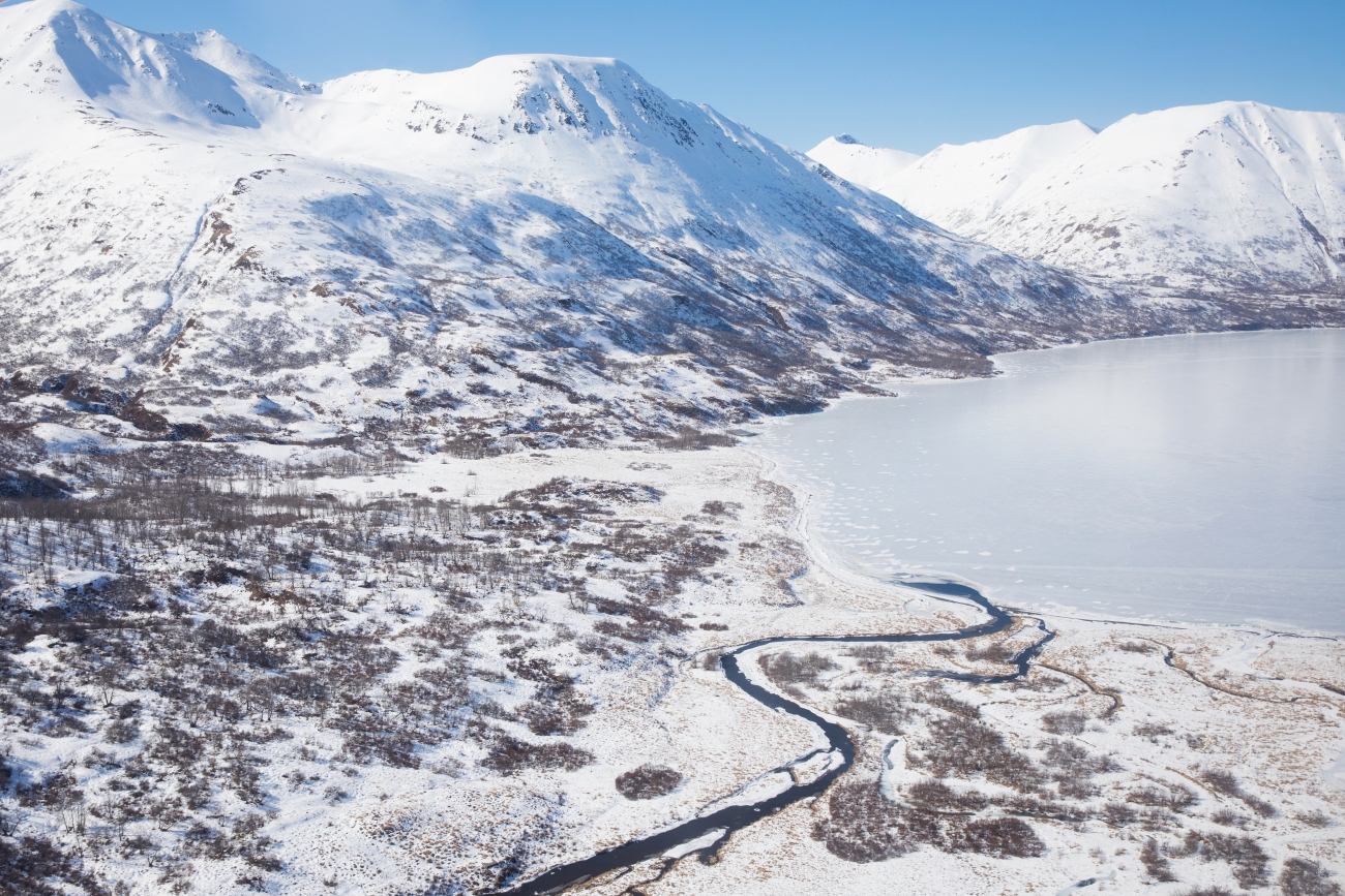 Aerial view of Karluk Lake and snow covered mountains at Kodiak NWR in Alaska.