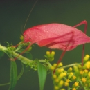 Close-up of pinkish red insect standing on green stalk with yellow blossoms, viewed from the side.