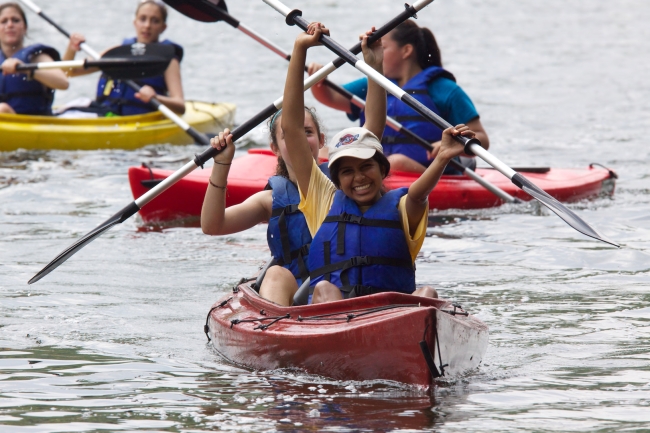 This is a picture of a pair of happy kayakers on the Potomac River.