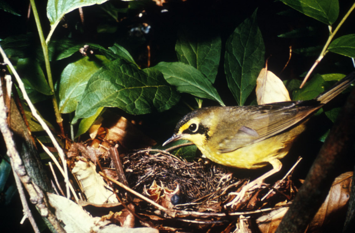 Kentucky warbler with nest of chicks.