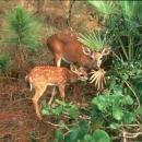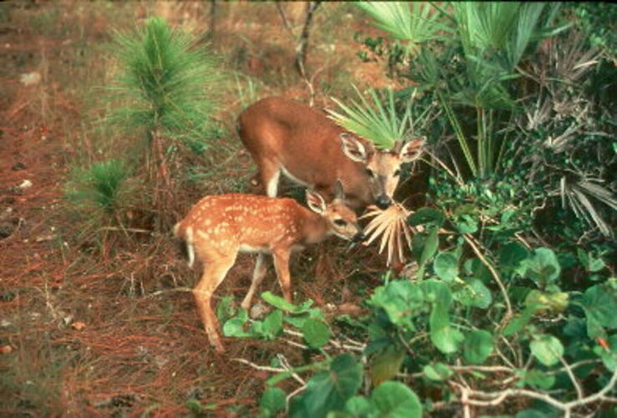 Mother and young key deer forage for food.