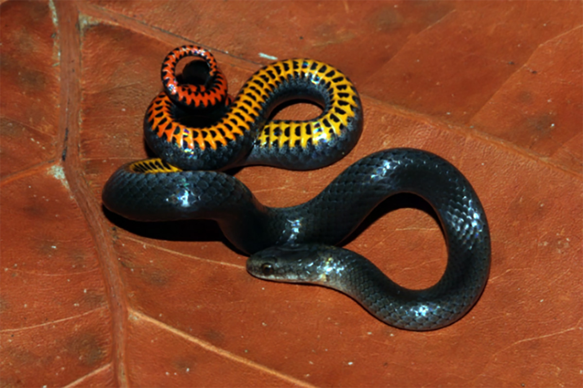 The Key ring-necked snake is small, 6- to 10-inches long as an adult, with a grayish-black back, bright yellow and red underside and an indistinct or absent neck ring. It is only found on the seven lower Florida Keys.