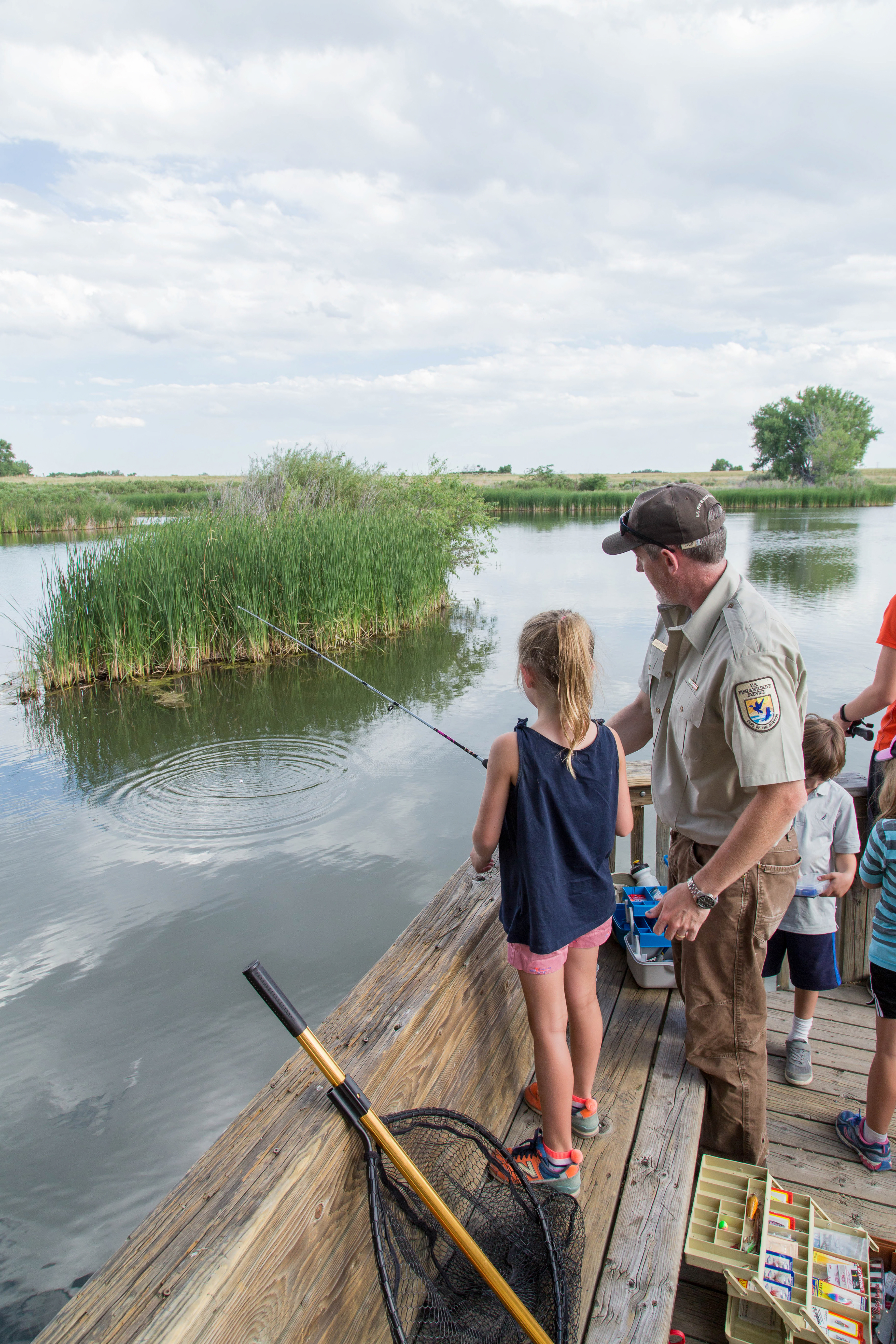 Kids fishing from a dock at Rocky Mountain Arsenal NWR.