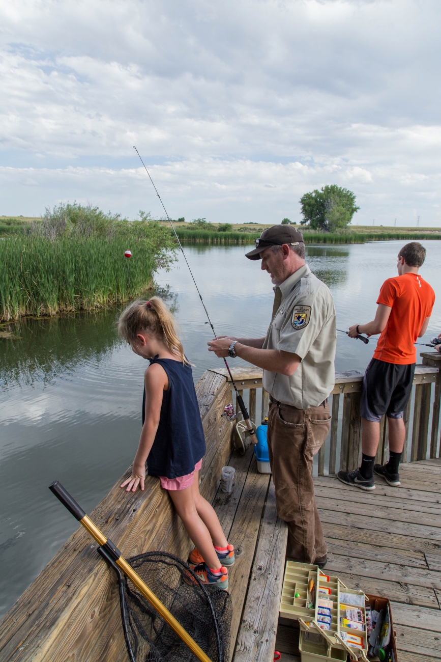 Kids fishing from a dock at Rocky Mountain Arsenal NWR.