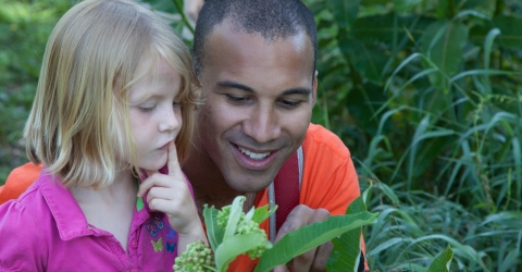 Kids and adult learn about common milkweed and Monarch butterfly. food.