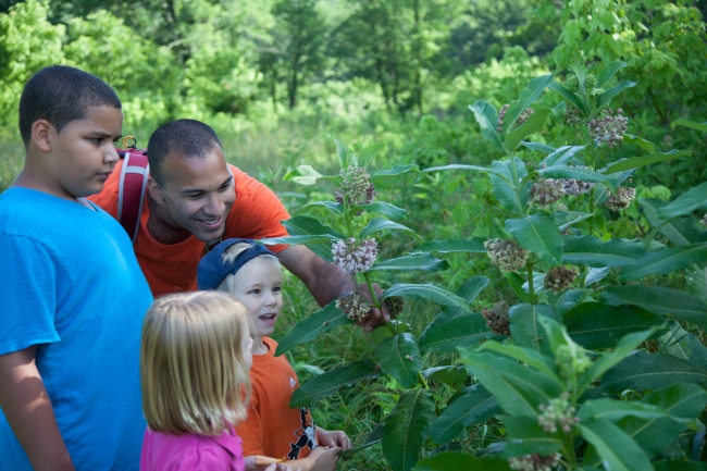 Kids and adult learn about common milkweed and Monarch butterfly. food.